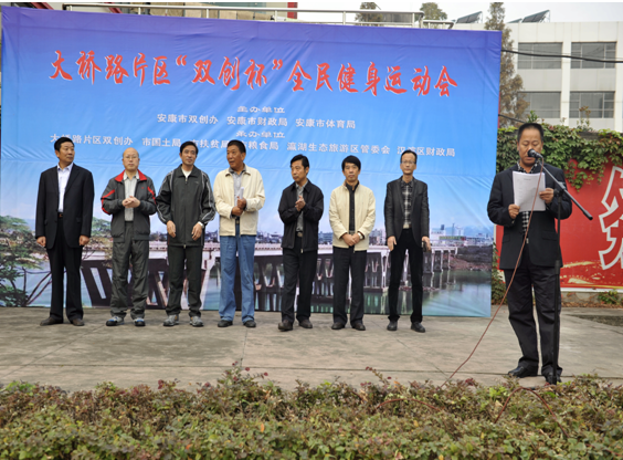 为了认真学习宣传贯彻党的十八大精神,谋发展,抓落实,宣传双创、推进双创、展现双创工作成果,10月22日,大桥路片区举行了“双创杯”全民健身运动会。本次运动会由安康市双创办、市财政局、市体育局主办,大桥路片区双创办、市国土局、市扶贫局、市粮食局、瀛湖生态旅游区管理局、汉滨区财政局承办。市委常委、常务副市长王安利出席开幕式并致辞。来自“双创”大桥路片区的19个单位,360多名干部职工参加比赛。比赛共设置篮球、乒乓球、羽毛球、拔河四个项目。